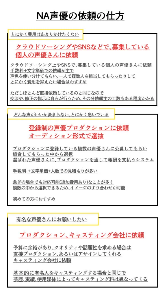 ではNAはどこに依頼すればいいのか?声優プロダクションでも、クラウドソーシングでも構いません。作風や技術がある方は、自分で声を録音して、編集する方もいます。