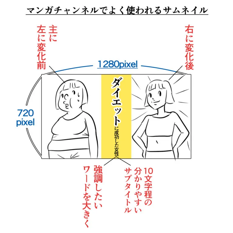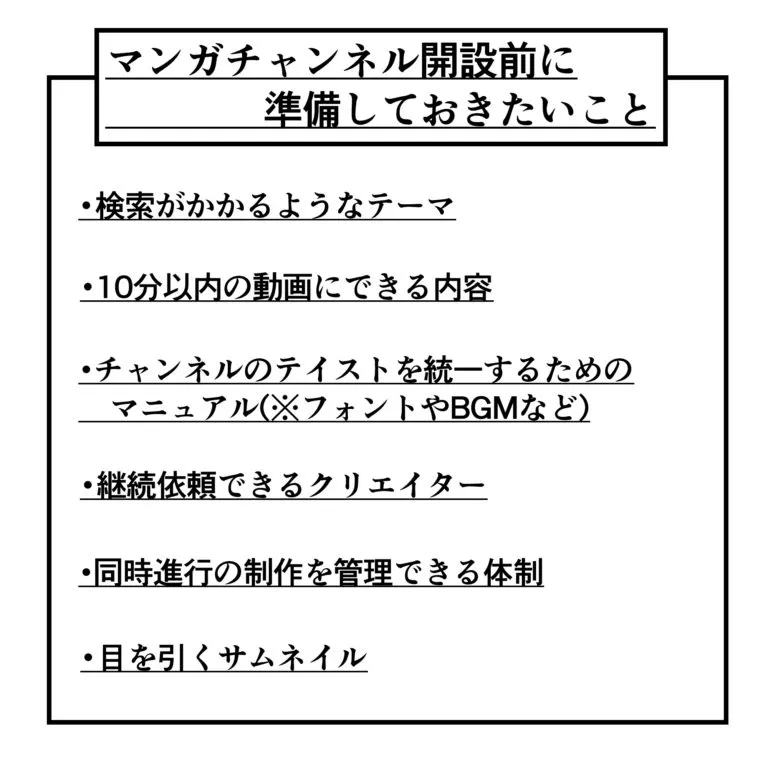 ①②のポイントは実写撮影のチャンネルでも、多くのチャンネルが実践していることですが、マンガチャンネルとして差別化を図るためには、実写では表現しづらいテーマや内容の動画を制作する必要があると言えます。