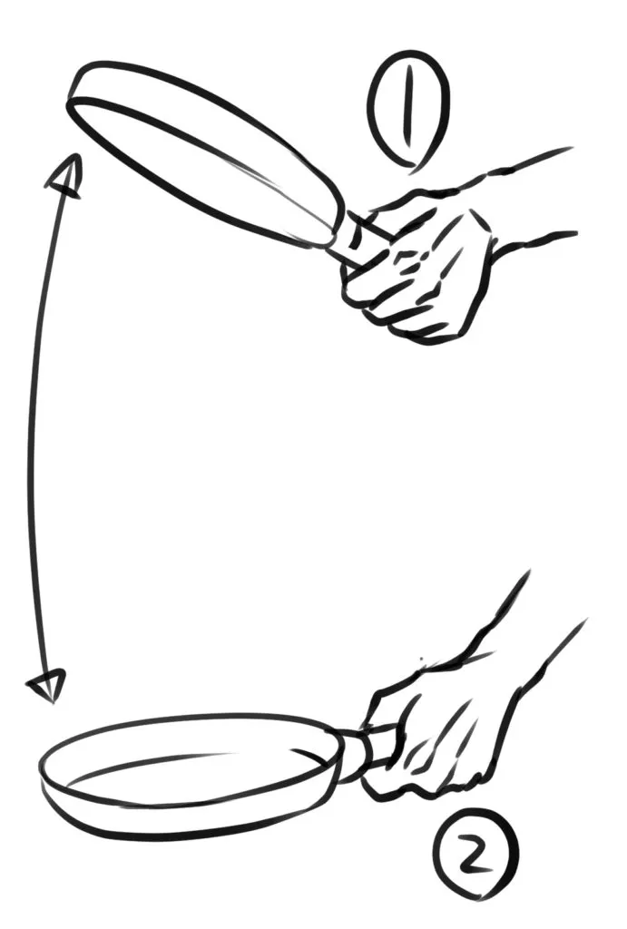 ただしマンガ動画の場合の弊害として、【角度を変えられないという】という点があります。3Dで表現されている場合は別として、2Dの一枚絵で描かれていますので、フライパンの表を描いた場合、裏を見せたりすることはできません。そのため上下に動かしたとしても、ずっとフライパンの表を見せていることになります。