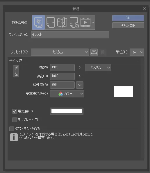 どういうことかと言うと、ファイル設定、主にキャンパスサイズは動画用に作らないと、編集の際に困ってしまうことが多いです。