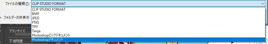 CLIP STUDIOはAdobeの動画編集ソフトと互換性はありませんが、Photoshopと互換性があるため、CLIP STUDIOで描いたものをPSDで保存して、動画編集ソフトに取り込みます。